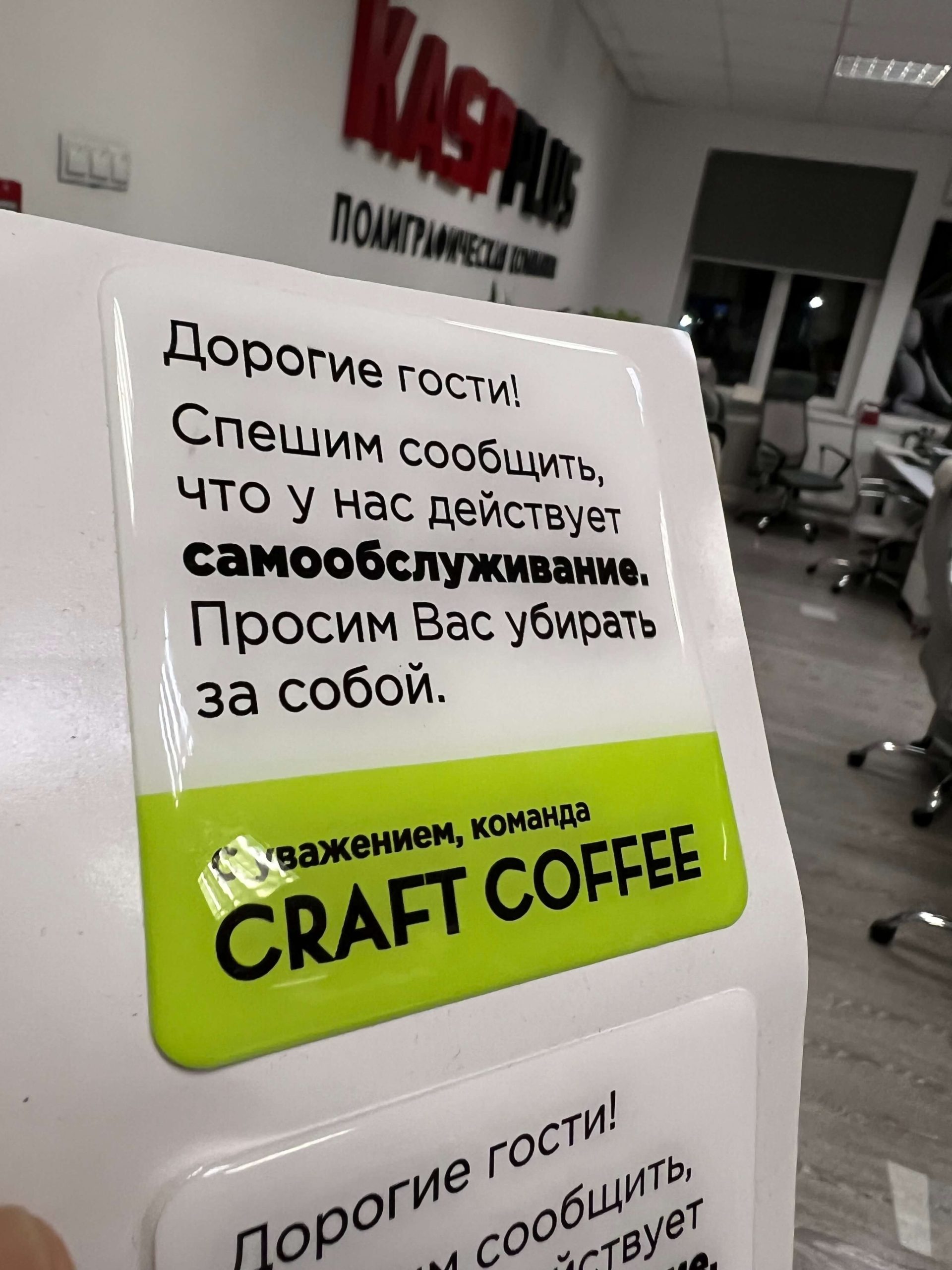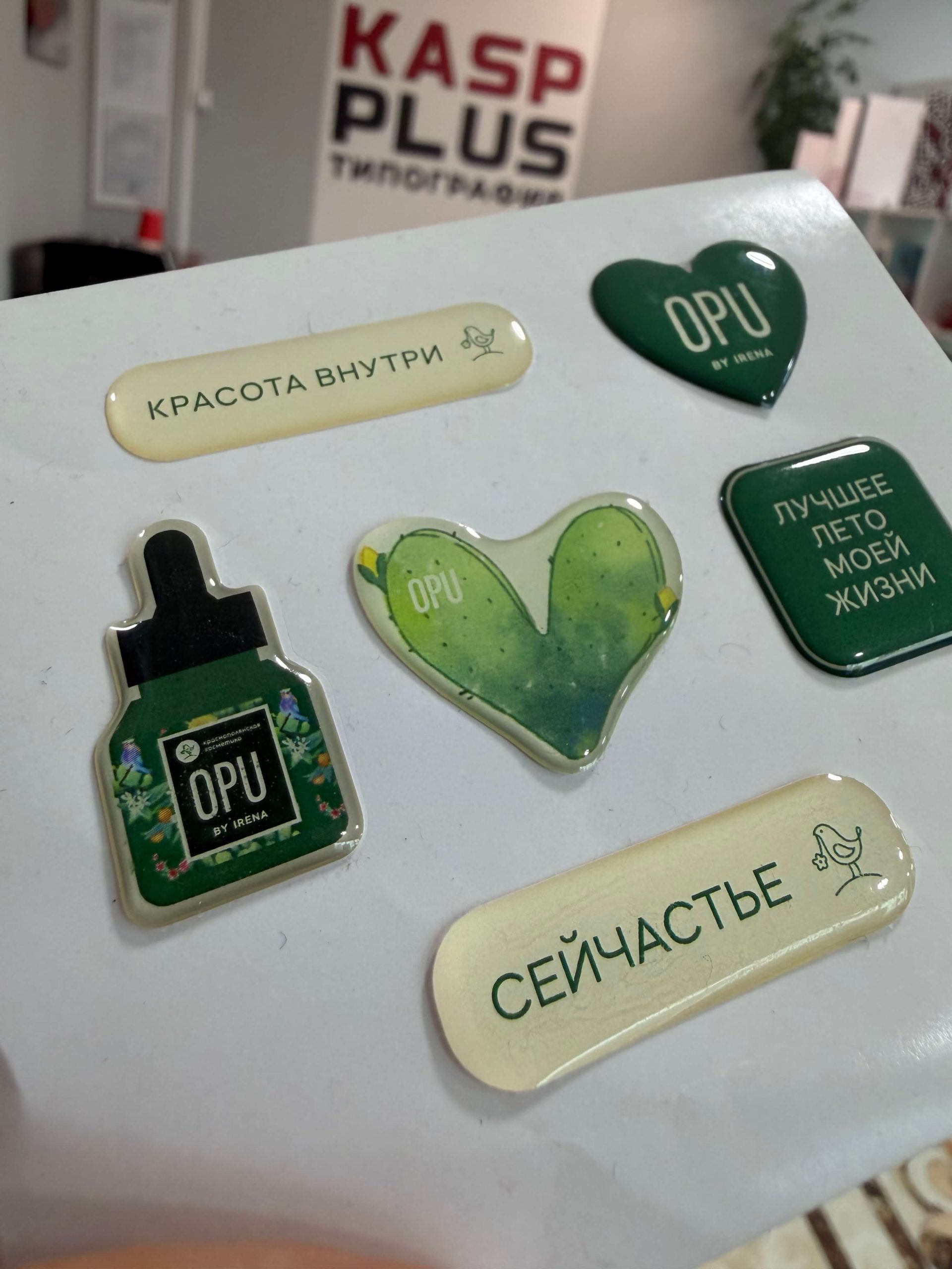 Объемные этикетки заливают прозрачной эпоксидной смолой, которая застывает в линзу и зрительно увеличивает изображение на 30–50%, делая цвета насыщеннее. Полимерный слой толщиной 1–5 мм придает 3D-эффект и защищает от царапин, влаги и УФ-лучей — срок службы до 5–10 лет на улице.
