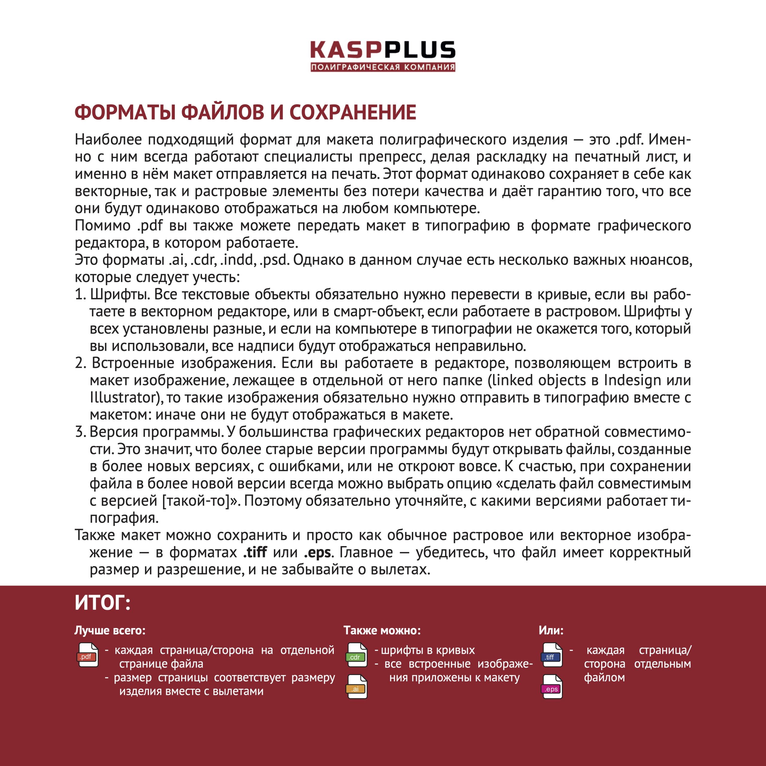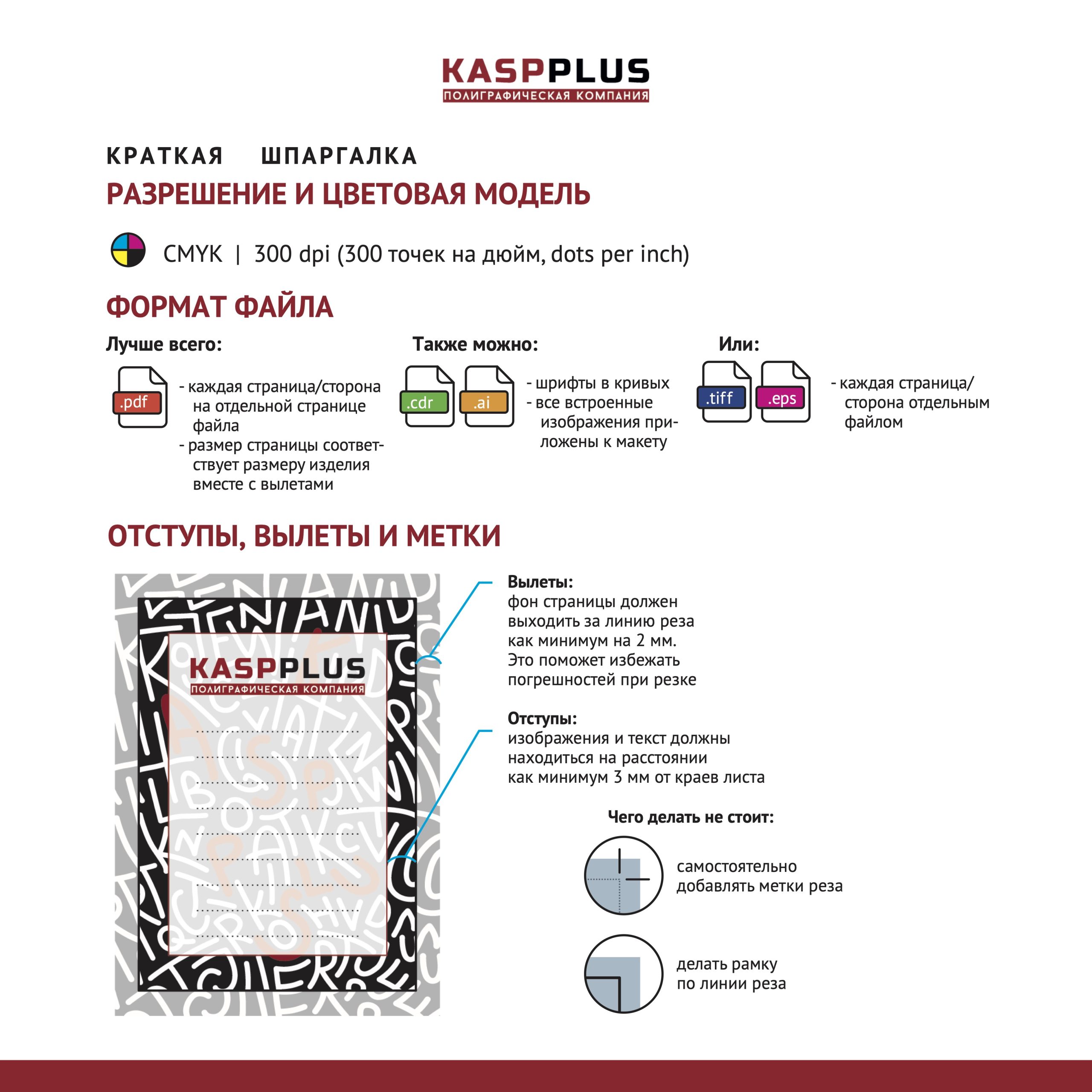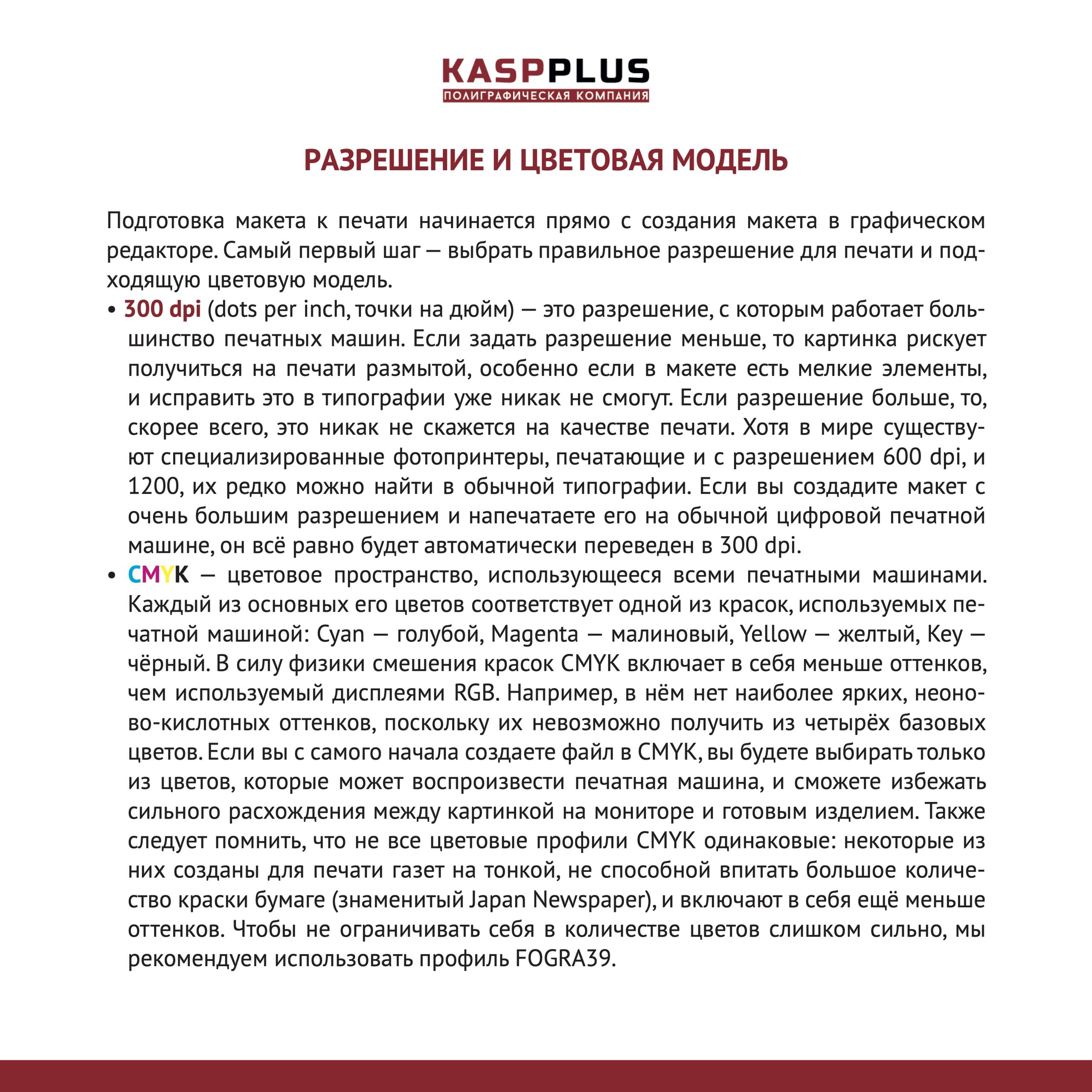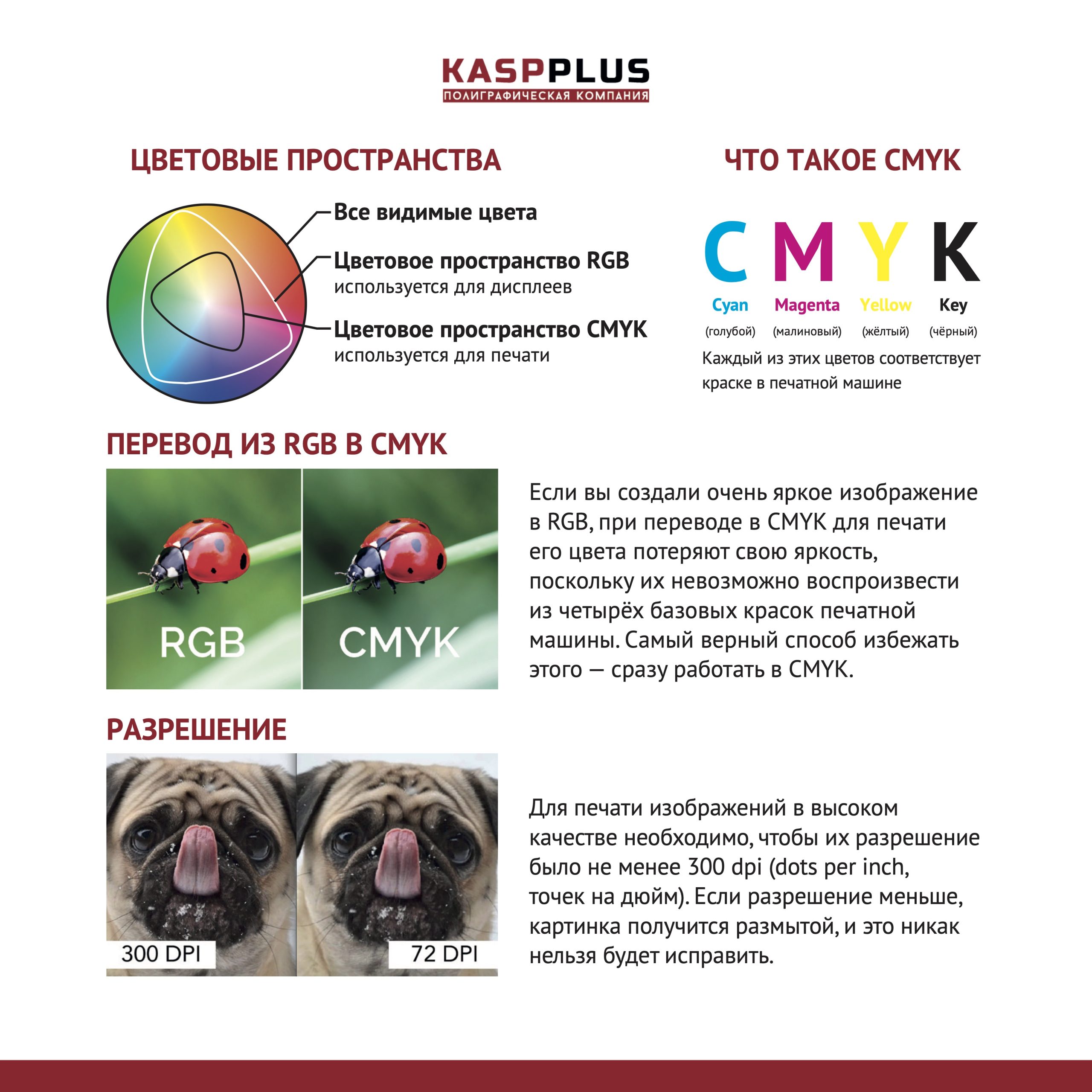 1. Все цвета как заливка, так и контур должны быть в цветовой модели CMYK 2. Все фотографии должны быть в цветовой модели CMYK, фотографии должны быть с разрешением не менее 300 dpi (точек на дюйм)